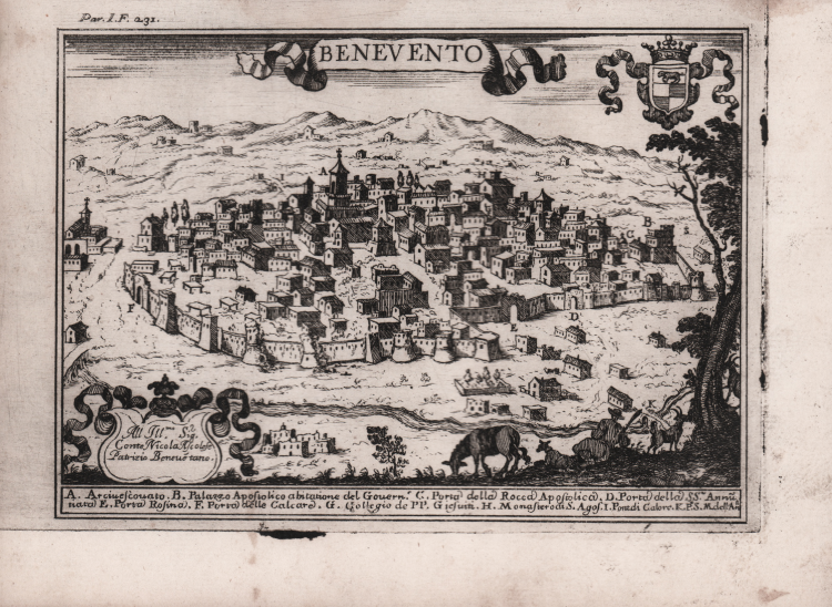 An added value and an integral part of Pacichelli's volumes are the sharp engravings depicting all the centres of the Neapolitan kingdom by Michele Luigi Muzio and the maps by Francesco Cassiano De Silva.