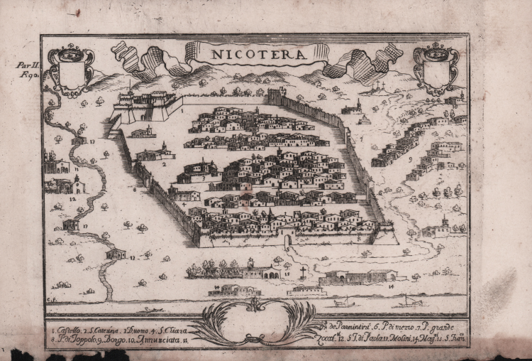 An added value and an integral part of Pacichelli's volumes are the sharp engravings depicting all the centres of the Neapolitan kingdom by Michele Luigi Muzio and the maps by Francesco Cassiano De Silva.