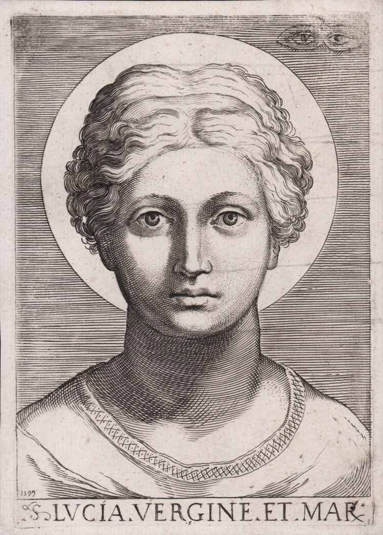 St Lucy, head and shoulders framed by a halo, with her eyes in the top right.