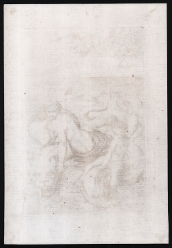 The depiction of Venus and Cupid plowing through the waves riding dolphins has a compositional structure reminiscent of the Venus Anadiomene, also derived by Dente from a preparatory drawing for another fresco in Cardinal Bibbiena's Stufetta, and of which this print can be considered the pendant. The individual motifs in the engraving are probably derived from ancient bas-reliefs found in Roman sarcophagi. In fact, the engraver draws from the classical repertoire by deriving from the heroes present in the ancient reliefs the figure of Cupid attempting to hasten his journey on the back of a dolphin by waving an arrow in the air. The sea monsters, on the other hand, seem to derive from Mantegna's Struggle of the Sea Gods (Bartsch, XII, 17-18). The figure of Venus, though caught from the back and in the precariousness of her position, is also inspired by classical models. The body is accurately rendered and reveals, despite the boldness of the foreshortening and the oblique position relative to the surface of the water, a perfect organicity and a great naturalness of movement in space. The modeling of the body of Venus, even more than with the Galatea of the Farnesina, engraved by both Marcantonio and Dente (Bartsch, XIV, 350 and 351), can be compared with Raphael's drawings Hebe and Proserpine of Haarlem and with the Three Graces of Windsor. On the basis of these arguments it is possible to assume that the preparatory drawing for this engraving was the work of Raphael and that the print is contemporary with the other depictions in the series relating to the Stufetta frescoes, which can be dated to around 1516.