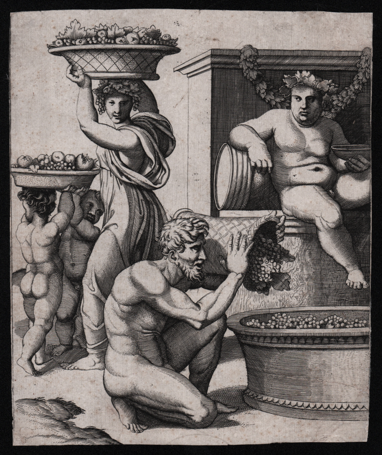 The engravings shows the harvesting of grapes, presided over by a thoughtful Silenus, cup in hand, accompanied by four harvesters who perform the festive ritual in powerful, exemplary postures.