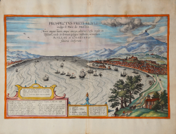 Bird's-eye view of the Strait of Messina after a drawing by Pieter Brueghel and adapted by Georg Hoefnagel; published in the sixth volume (1617) of the Civitates Orbis Terrarum, the first atlas devoted exclusively to plans and views of the world's major cities. Printed in six volumes between 1572 and 1617 it was so successful and widespread that several editions translated into Latin, German and French were printed.