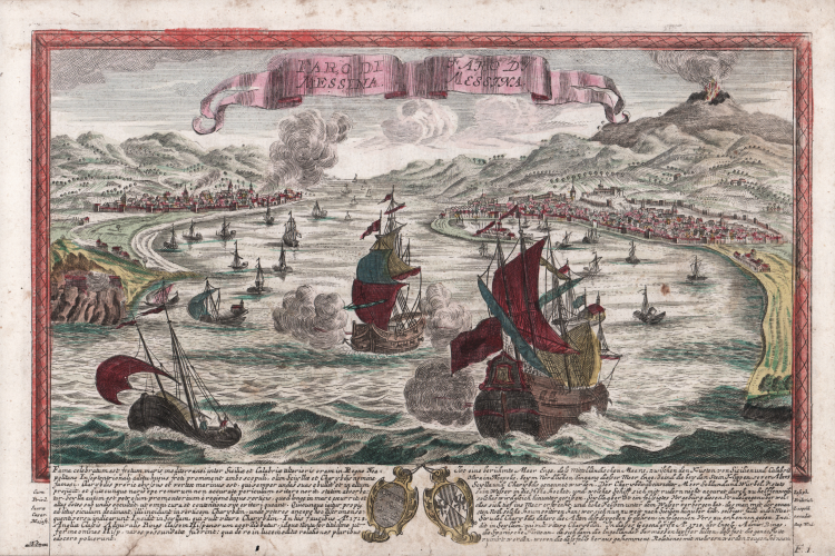 Beautiful and rare panoramic view of the Strait of Messina sketched in the wake of the greatest views drawn by Fredrich Bernhard Werner and published in Augsburg by the heirs of publisher Jeremias Wolff (1663-1724), Georg Balthasar Probst (1673-1750) - his son-in-law- and his successor, his son Johann Friedrich (1719-1781).