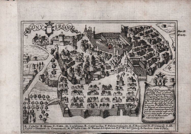 An added value and an integral part of Pacichelli's volumes are the sharp engravings depicting all the centres of the Neapolitan kingdom by Michele Luigi Muzio and the maps by Francesco Cassiano De Silva.