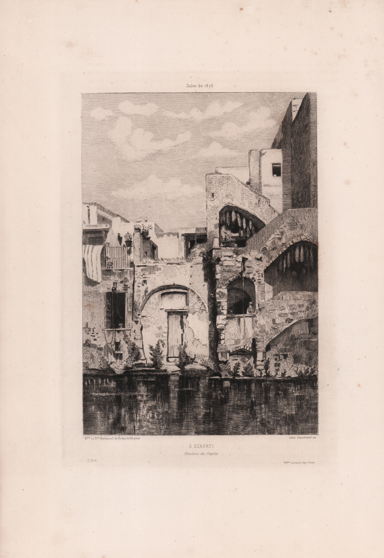 Veduta di Scafati, con il fiume in primo piano e, più in là, gruppo di edifici in pietra. Pubblicata in “L'Art”, volume VI, 1876.