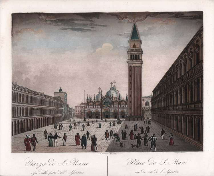 Magnifica veduta tratta dal raro La R. Basilica di S. Marco esposta in sei tavole. Disegnate ed eseguite all’Acquatinta da Antonio Lazzari. Copiosamente descritta nelle due lingue Italiana e Francese da Giuseppe Piazza dedicata a sua Eminenza Jacopo Monico, Cardinale di S. Chiesa, album stampato a Venezia nel 1835 e composto di sei magnifiche acquetinte di Antonio Lazzari.