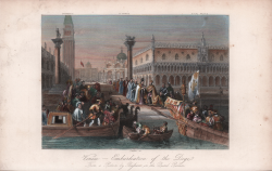 View at the landing of the lagoon in Venice, with the doge greeting a figure with a sword, spectators on boats in the foreground, Saint Mark's Square in the left background; after William Henry Bartlett.