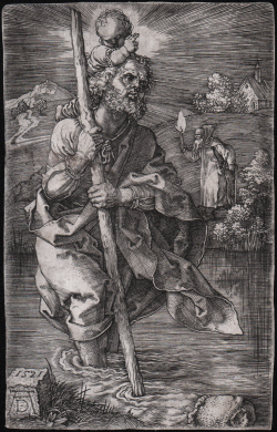 This and the print of St. Chrisopher facing left were probably produced during the second half of 1521 after Dürer had returned to Nuremberg. They are close in design to the drawing on coloured ground, which Dürer probably made while he was in the Netherlands as well as the sheet of studies of St Christopher dated 1521 in Berlin (Strauss 1521/14). Heller records six copies of each of these prints of St Christopher, an indication of their popularity.
