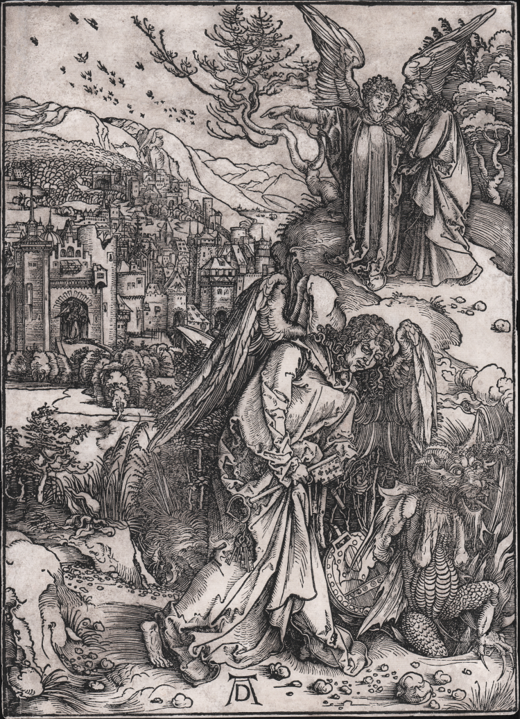 The angel with the key of the bottomless pit; in the foreground the angel chains Satan in the bottomless pit, in the background an angel shows St John a town representing the New Jerusalem.