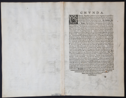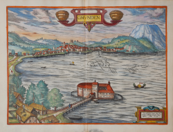 Nice view of Gmunden, after a drawing by Lucas van Valckenburg. Published in the fifth volume of the Civitates Orbis Terrarum, the first atlas devoted exclusively to plans and views of the world's major cities. Printed in six volumes between 1572 and 1617 it was so successful and widespread that several editions translated into Latin, German and French were printed.