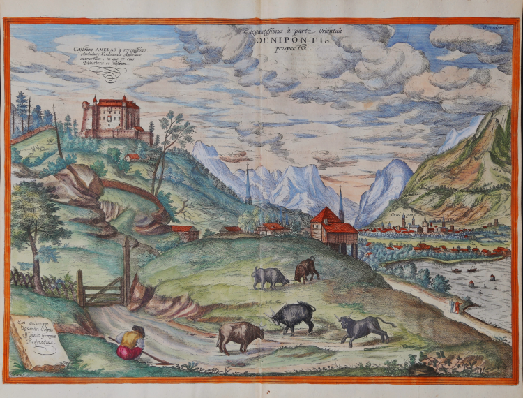 Perspective view of Innsbruck by Georg Braun & Frans Hogenberg, after Alexander Colyns & Joris Hoefnagel, first published in the fifth volume of the Civitates Orbis Terrarum, the first atlas devoted exclusively to plans and views of the world's major cities. Printed in six volumes between 1572 and 1617 it was so successful and widespread that several editions translated into Latin, German and French were printed.