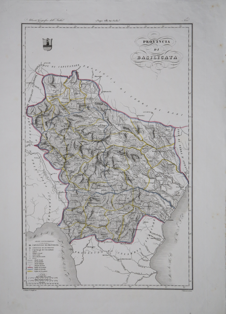 Attilio Zuccagni Orlandini (Fiesole 1784-Firenze 1872), who realized the great Atlante Geografico Fisico e Storico of Tuscany, consisting of 20 big plates with explicatory text and published between 1828 and 1832, prolonged to the whole Italian peninsula a graphic and descriptive illustration, published in 1845, consisting of 19 books and a big atlas in 5 in folio volumes, called "Corografia Fisica, Storica e Statistica dell'Italia e delle sue Isole" supplied with the "Atlante illustrativo ossia Raccolta dei principali monumenti italiani antichi, del Medio Evo e moderni e di alcune vedute pittoriche per servire di corredo alla corografia fisica storica e statistica dell’Italia di Attilio Zuccagni-Orlandini". The work has been published in Florence by the Società Editrice between 1842-45. Giacinto Maina, Valerio Stanghi, Antonio Verico and others engraved the plates.