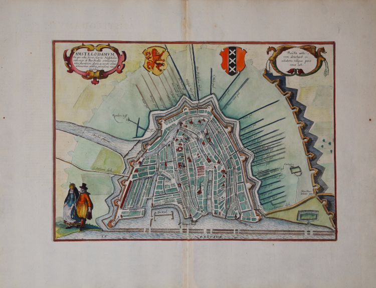 Plan of Amsterdam published in the sixth volume of the Civitates Orbis Terrarum, the first atlas devoted exclusively to plans and views of the world's major cities. Printed in six volumes between 1572 and 1617 it was so successful and widespread that several editions translated into Latin, German and French were printed.