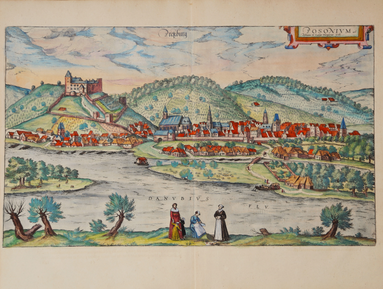 Bird's-eye view of Bratislava, included in the forth volume (1588) Civitates Orbis Terrarum, the first atlas devoted exclusively to plans and views of the world's major cities. Printed in six volumes between 1572 and 1617 it was so successful and widespread that several editions translated into Latin, German and French were printed.