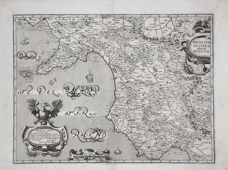 Nel cartiglio in alto a destra il titolo PRINCIPATO CITRA olim PICENTIA. In basso a destra il cartiglio con la dedica All’ Ill.mo Sig.r mio P[at]ron[us] Col.mo il Sig.r Massimo Caprara. Havendo V.S. non poco gusto delle Mathematiche, et in particolare della Geografia, ho voluto dedicarle questa tavola, che servirà per testimonio delli molti oblighi, ch’io le tengo, per havermi sempre favorito, con tanta prontezza, ne i miei maggior bisogni. E le bacio le mani. Di Bologna il di p.o Nove[m]bre 1606. Di V. S. Ill.ma Serv.re Aff.mo Fabio di Gio. Antonio Maginij Pad.o e la scala grafica Scal di Miglia (15 miglia pari a mm 76). Orientazione nei quattro lati al centro con il nome dei punti cardinali Septentrio, Meridies, Oriens, Occidens, il nord in alto. Graduazione ai margini di 1’ in 1’ da 40° 30’’ a 41° 1’ di latitudine, e da 37° 21’ a 39° 7’ di longitudine.