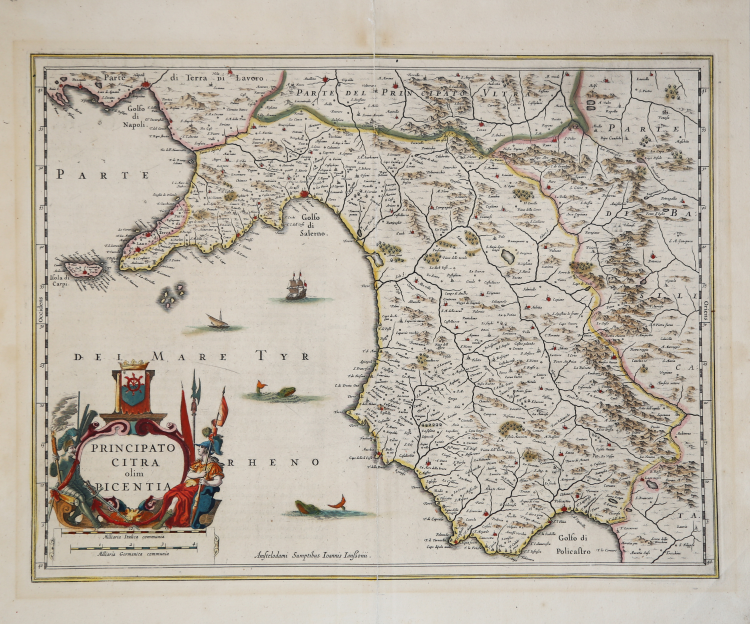 The maps of Italy, derived from Magini, were first printed in the Theatrum Italiae in quo Eius Regna, Domina, Ducatus, Et Speciatim Illorum Provinciae, Tabulis Accuratissimis, Iam, De Novo in Lucem Editio, Describunter, Quorum Sequens Page Indicabit, printed in Amsterdam by Hendrick Hondius in 1636. Although imprinted by Hondius, the collection also contains maps signed by Johannes Janssonius (see Koeman, Atlas Neerlandici, vol. II pp. 379-380, Me 43).