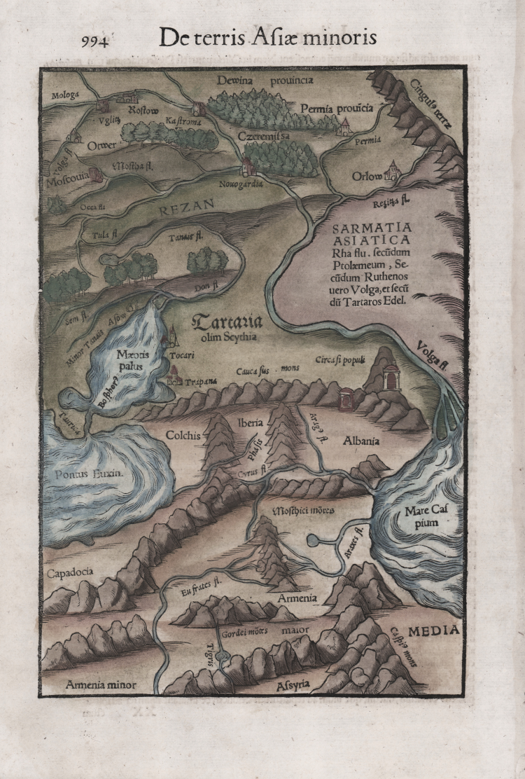 Woodblock map of the region between the Black and Caspian Seas including Georgia, Armenia, Azerbaijan and Russia up to about Volgograd. Strongly engraved, it features the rivers, forests, mountains and major cities. Plate taken from the Cosmographiae Universalis, Latin edition, Basel, half of the 16th Century.