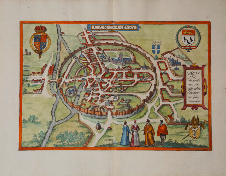 Bird-eye-view of Canterbury, included in the fourth volume (1588) of the Civitates Orbis Terrarum, the first atlas devoted exclusively to plans and views of the world's major cities. Printed in six volumes between 1572 and 1617 it was so successful and widespread that several editions translated into Latin, German and French were printed.