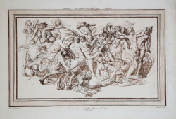 The battle of the Centaurs and Lapiths; fighting figures with clubs and vessels raised as weapons; in a rectangular frame imitating a wash mount; after Perine del Vaga.