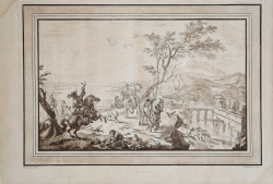 Hawking: a rural landscape with a river at right and mountains in the background, inhabited by various figures, three of which on horseback; a woman and a man, respectively at centre and at left, hawking, birds flying above them, a man kneeling next to a dead bird at the centre in the very foreground, dogs running about; after a drawing by Wouwerman; in rectangular frame in imitation of a wash mount.