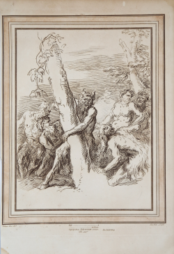 Satyrs and Sileni in the forest, a Satyr at the centre hugging a tree; after a drawing by Salvator Rosa.