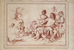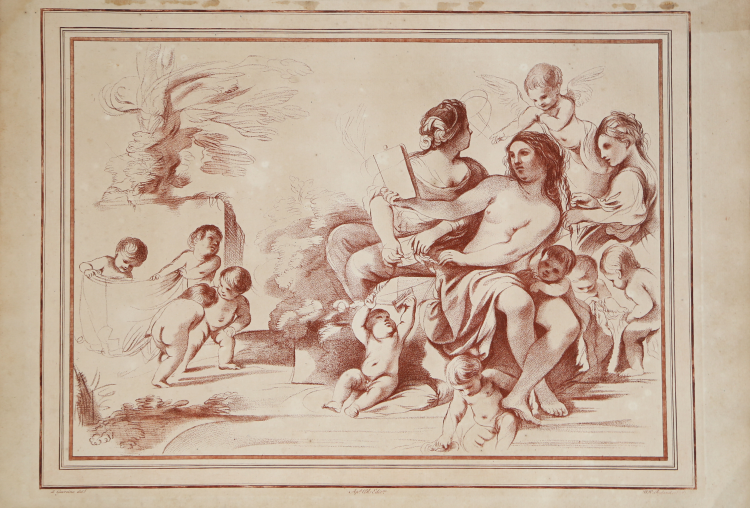 Psyche sitting on the right, looking at herself in the mirror, attended by amorini, including four who bring her clothes from the left, and two women who braid her hair; after a drawing by Guercino; in rectangular frame in imitation of a wash mount.