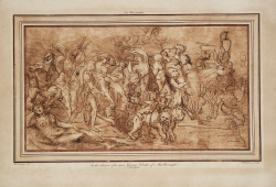 Bacchanalian procession; a woman sleeping on the ground to left, satry and a figure blowing on two pipes to left, behind two others carrying a man, girl playing tambourines dancing in front and looking back at him, Silenus on his ass supported by others to right, lions walking in the foreground and an angel overhead in the centre; after Annibale Carracci.