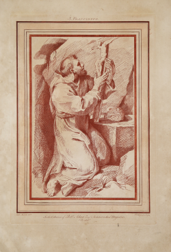 St Francis kneeling in a cave, barefoot, tonsured, wearing a hooded robe, adoring a crucifix which he holds in both hands, resting it on a ledge of rock in front of him to right, beside a skull, after Carlo Maratti.