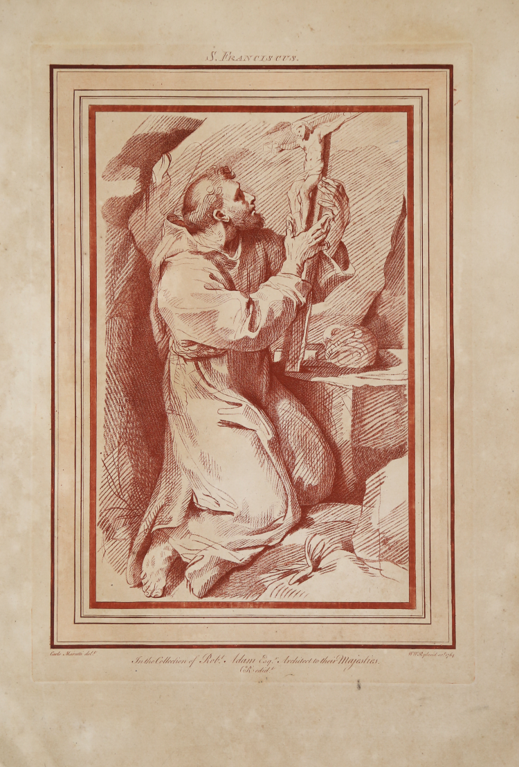 Roulette printed in red, 1764, lettered above the image with the title, and below: 'In the Collection of Robt. Adam esqr. architect to their Majesties. CR edidt. Carlo Maratti delt. W.W. Ryland sct. 1764".