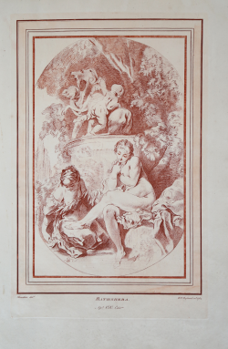 Bathsheba, nude, and another woman, dressed, seated on a river bank, next to a statue representing two putti playing with a goat. After François Boucher.