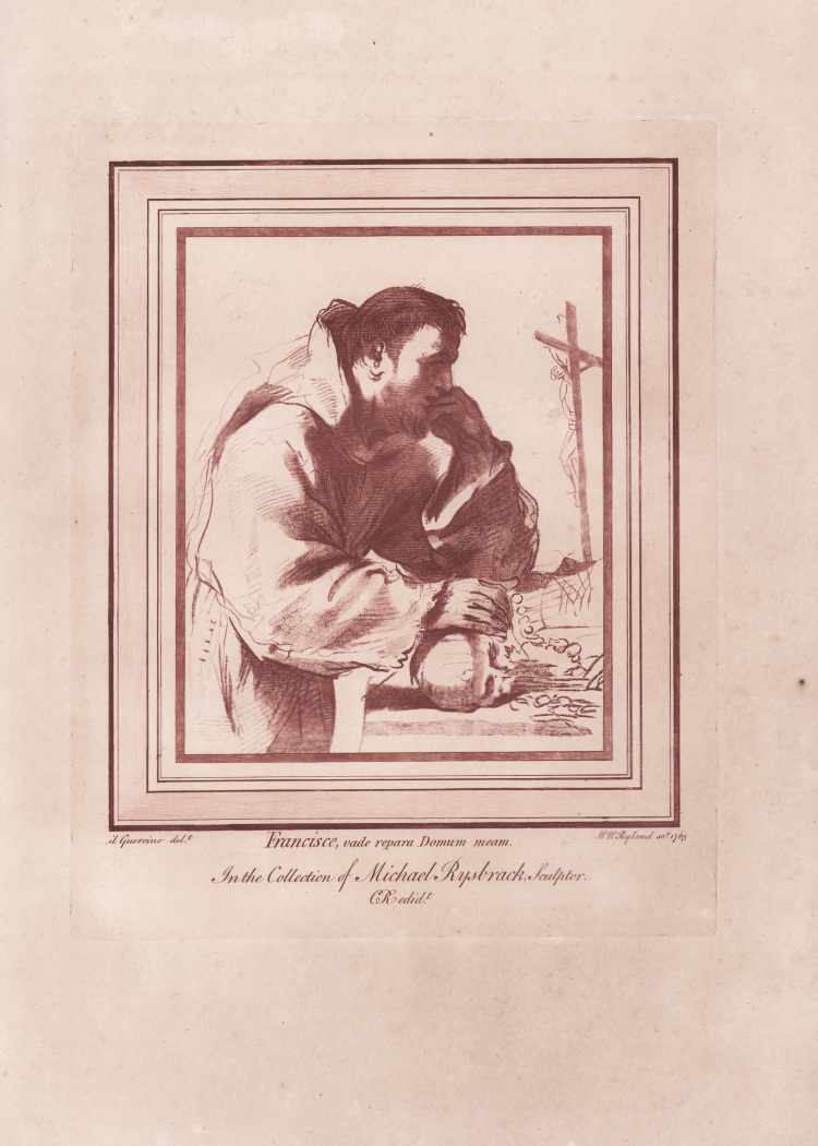 St Francis contemplating a crucifix; half-length to right, his head resting on his left hand, his right hand on a skull; after a drawing by Guercino; in rectangular frame in imitation of a wash mount.