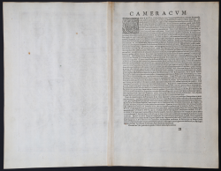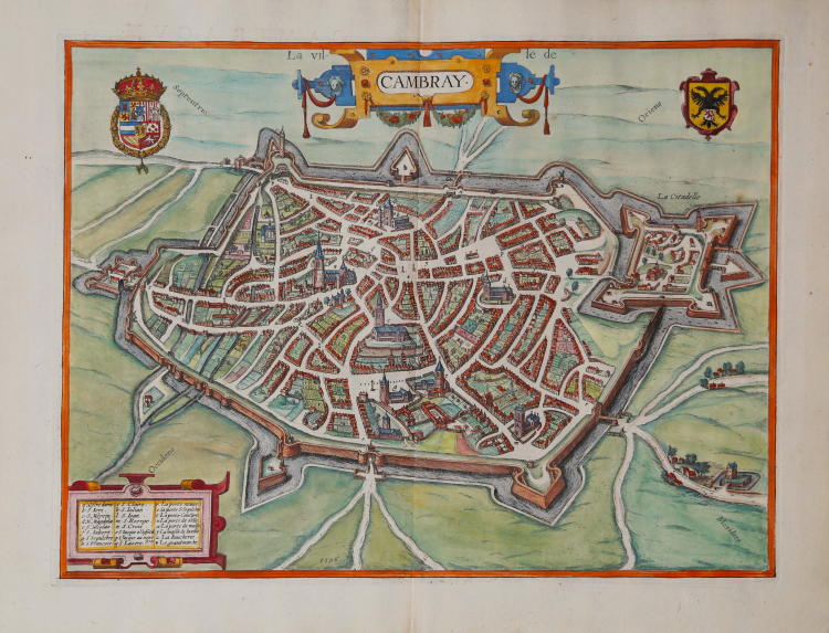 Bird-eye-view plan of Cambrai, France, published in the fifth volume (1597) of the Civitates Orbis Terrarum, the first atlas devoted exclusively to plans and views of the world's major cities. Printed in six volumes between 1572 and 1617 it was so successful and widespread that several editions translated into Latin, German and French were printed.