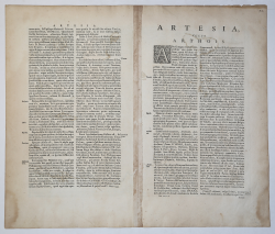 Fine map depicts the northern province of Artois on the border with Belgium. Fully engraved, it illustrates forests, rivers, bridges, cities and villages. A fishing boat, sea monster and compass rose grace the sea and an elaborate title cartouche with the coat of arms completes the map.