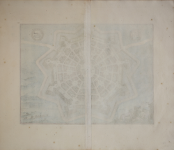 Pianta prospettica di Palmanova pubblicata da Johannes Janssonius nel 1657 circa, qui nella ristampa di Frederick de Wit edita ad Amsterdam verso il 1680.