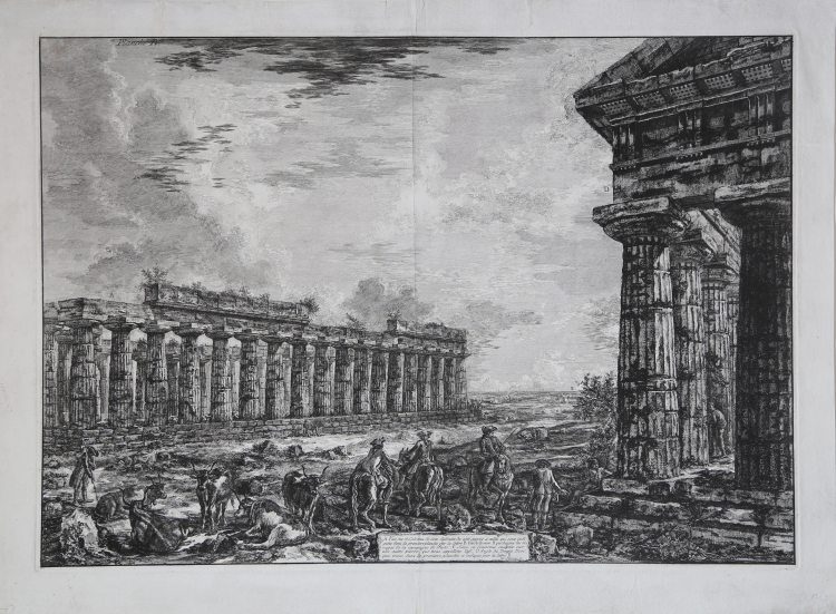 The series of the views of Paestum, realized in 1778, is the last work Piranesi realized before his death. Although he was already an archaeology expert, he went to visit the three temples in 1777 to realize his preparatory drawings for the engravings (twenty plates and the front page). Only 18 of these plates have been signed by Giovan Battista, while three bear the signature of his son, Francesco.