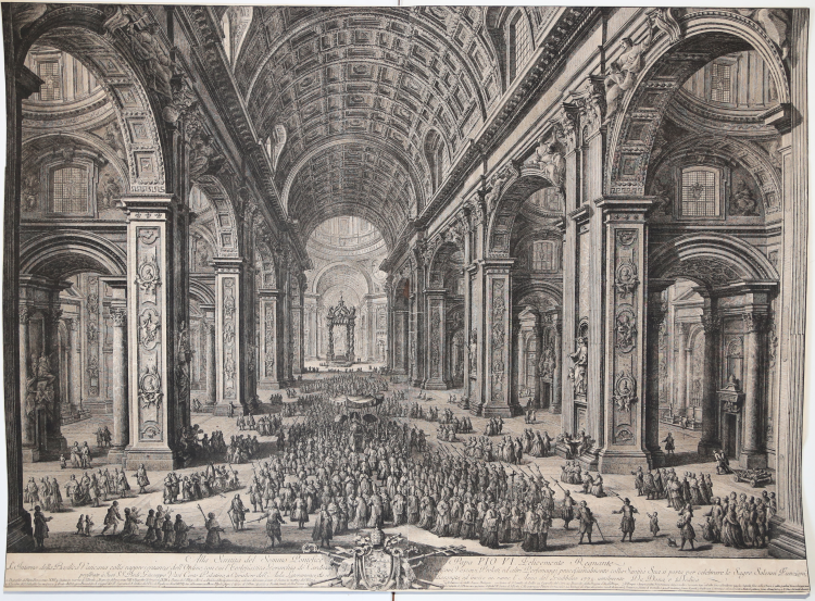 Designed and etched during the jubilee year of 1775, the print shows an interior view of St. Peter's in which Pope Pius VI, cardinals, archbishops, bishops, prelates, and other dignitaries proceed down the nave in performance of solemn functions; Kneeling viewers look toward the pope, who is seated on a sedan chair below a baldachin or canopy, flanked by officers holding flabella. The architecture of the nave is rendered in detail, with captions listing the tombs, sculptures, tabernacles, chapels, and pictorial decorations.