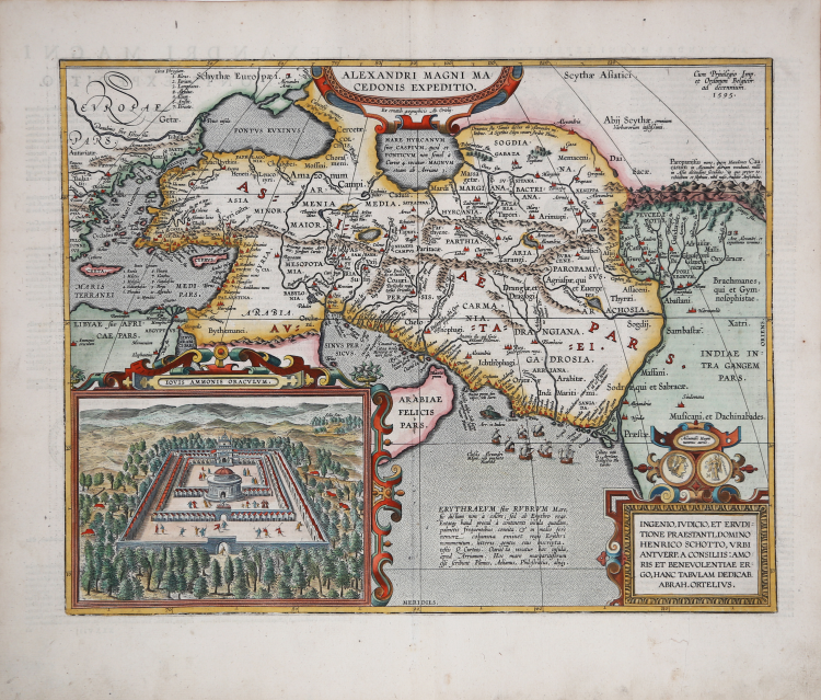 The inset shows the oracle of Jupiter Ammon, supposedly situated in present day Libya, where Alexander went to ask what would be the result of his expedition. He also expressed the desire to be buried there, but was eventually buried in Alexandria in Egypt. Ortelius derives his information on the oracle from Lucretius, Solinus, Ovidius, Lucanus and many others. He complains that more attention is paid by classical authors to Alexander's personal habits, than to the regions and territories he conquered, but restricts his own discussions to the two Iupiter Ammon temples and statues, and does not discuss Alexander's travels.