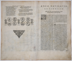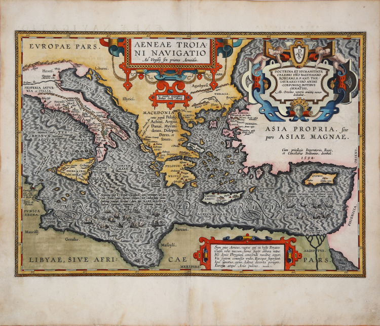 Title: AENEAE TROIA:|NI NAVIGATIO | "Ad Virgilii sex priores Æneidos. [The sea journey of Troian Æneas, after the first six books of the Æneas by Vergilius]. Cartouche top right: DOCTRINA ET HVMANITATE | CELEBRI DÑO BALTHASARO | ROBIANO, R.P. ANT, THE:|SAVRARIO, VIRO ANIMI | CORPORISQ DOTIBVS | ORNATISS. | "Ab. Ortelius veteris amicitiæ memor | dedicabat. [In memory of his friendship, Abraham Ortelius dedicated this map to the honourable and famous Balthasar Robianus from the republic of Antwerp, known for his learnedness and spiritual and cultural qualities, treasurer and honoured for his physical and mental talents]. Middle right: "Cum priuilegio Imperatorio, Regio, | et Cancellariæ Brabantiæ, decennali. | 1594". [With an Imperial, Royal and Council of Brabant privilege for ten years, 1594]. Lower left: "Septima post Troiæ excidium iam vertitur æstas: | Cum freta, cum terras omnes, tot inhospita saxa, | Syderaque emensæ ferimur: dum per MARE MAGNVM | Italiam sequimur fugientem, & volvimur undis". [In the seventh year after the loss of Troy the summer has come to an end; so many straits we have seen, so many lands, such inhospitable rocks, that now we are impressed by the immense stars. We follow fleeing Italy through the large sea, and are tossed around by the waves].
