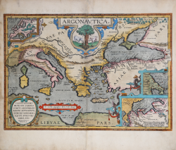 The map is a depiction of the travels of Iason and his companions in their quest for the Golden Fleece, on their ship named Argo. Ortelius, basing himself on a host of classical authors, counts more than 80 Argonauts by name, and provides sources for each of them as he established them in ancient writings.