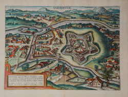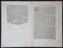 Bird-eye-view of Oradea (Nagyvárad) published in the sixth volume (1617) of the Civitates Orbis Terrarum the first atlas devoted exclusively to plans and views of the world's major cities. Printed in six volumes between 1572 and 1617 it was so successful and widespread that several editions translated into Latin, German and French were printed.