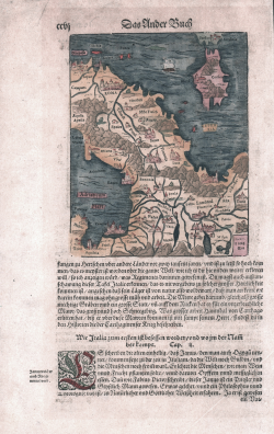 Small, early woodcut map of Italy with Corsica and Sardinia by Sebastian Münster. On the verso is a map of north-central Italy - oriented with South at the top - based on the famous model by Erhard Etzlaub (Das ist Rom Weg, c. 1500), an itinerary map for pilgrims who had to reach Rome.