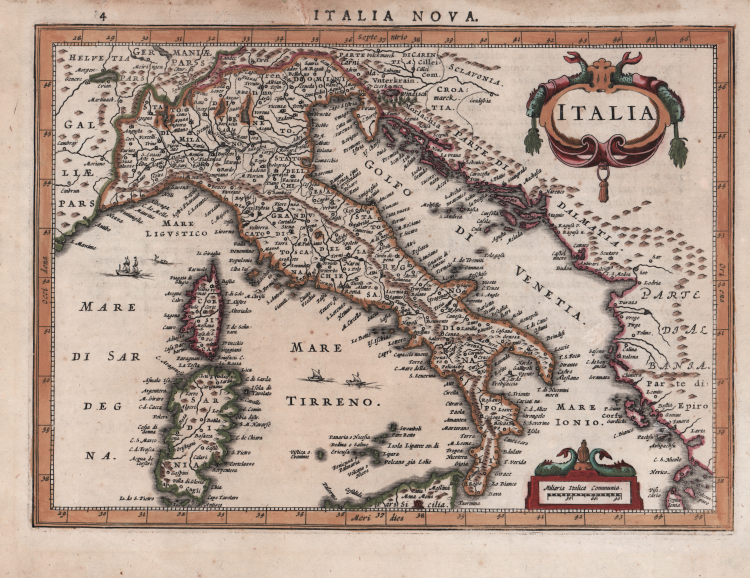 Plate taken from Nova et accurata Italiae hodiernae descriptio in qua omnium eius regionum, vrbium, pagorum, dominiorum, castellorum, montium, fluviorum, fontium, lacuum, et portuum, historia exhibetur. Geographicis tabulis et vrbium praecipuarum iconibus illustrata a Iudoco Hondio addita est Siciliae, Sardiniae, Corsicae, et itinerariorum per Italiam brevis delineatio, printed in Leiden by the printing house Elzevir in 1627.