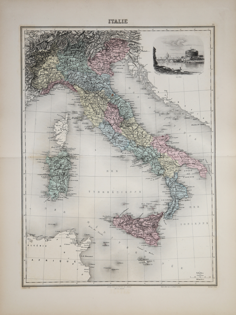 This French atlas is one of the most decorative atlases of the late 19th century. In addition to being hand colored, the majority of the maps feature one or more superb vignettes showcasing key cities or monuments from the region. The atlas contains 43 maps (41 of which are double-page), including one celestial chart, six historical maps, and 37 modern maps.