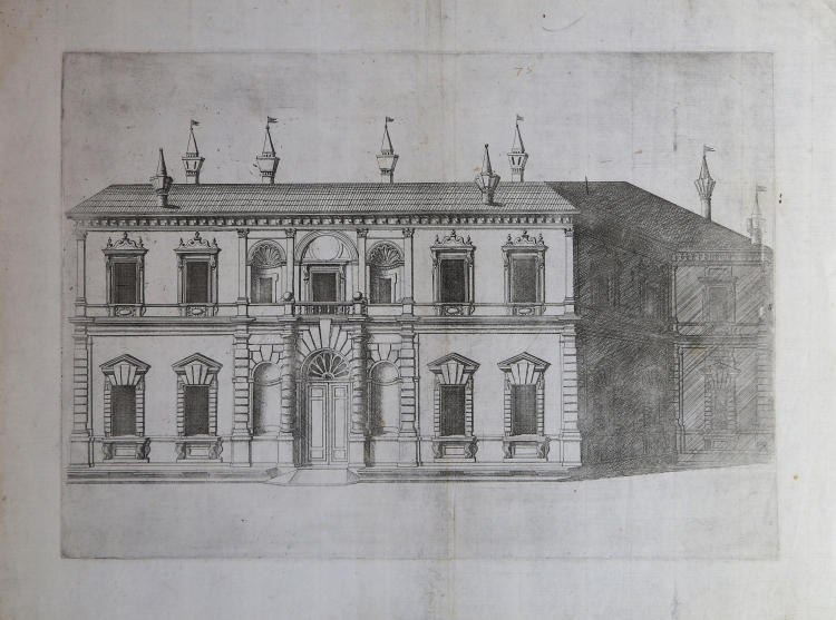 “The engraving depicts Villa Giulia, commissioned by Julius III (1550-1555) from Vignola. Work began in 1551. ‘With its rusticated jambs and the blocks of rusticated ashlar through which the portal columns rise, the façade of Vignola’s first Roman building, the palazzina of Julius III’s villa, recalls Palazzo Bocchi. The articulation of the center of the façade is innovative; the three bays are arranged according to the scheme of a triumphal arch, and executed in stone, so as to make this part of the façade stand out against the flat brick side walls. The villa’s location outside the city walls explains both the reminiscences of fortified architecture and the motif of the triumphal arch on the façade’” (see Marigliani, VI.26).