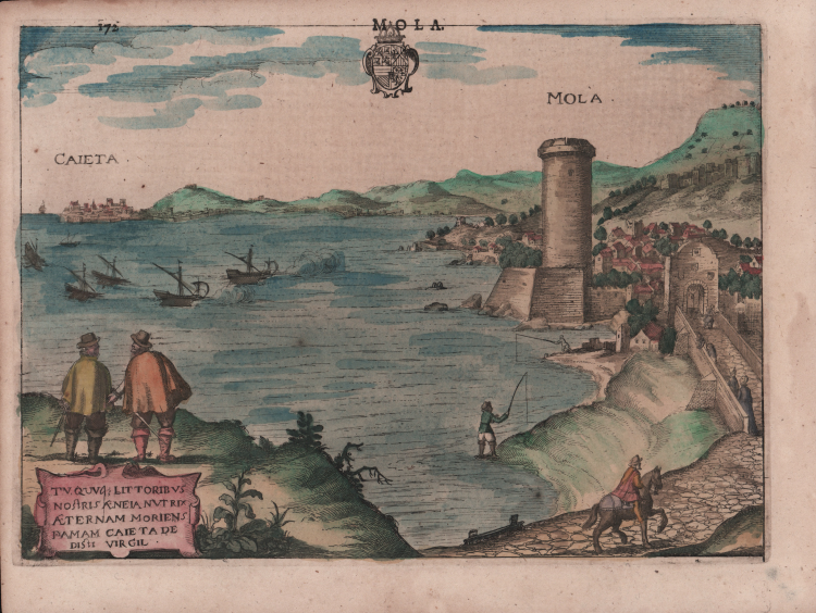 Plate taken from Nova et accurata Italiae hodiernae descriptio in qua omnium eius regionum, vrbium, pagorum, dominiorum, castellorum, montium, fluviorum, fontium, lacuum, et portuum, historia exhibetur. Geographicis tabulis et vrbium praecipuarum iconibus illustrata a Iudoco Hondio addita est Siciliae, Sardiniae, Corsicae, et itinerariorum per Italiam brevis delineatio, printed in Leiden by the printing house Elzevir in 1627.