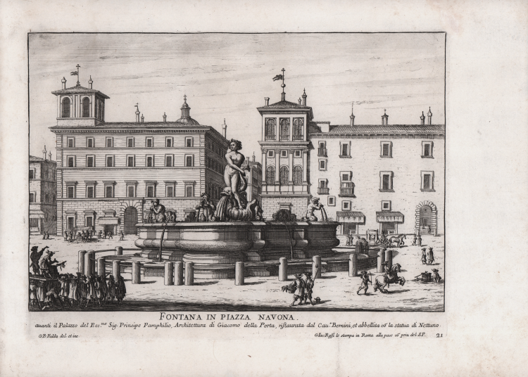 Falda, a native of Valduggia, at the age of 14 was sent to Rome and entrusted to the care of an uncle who pointed him out to Gian Lorenz Bernini. But it was the meeting with the printer Giovanni Giacomo De Rossi that marked a turning point in Falda's artistic career: in fact his talent was directed by the publisher to the art of engraving. His apprenticeship in the Roman printing house was well received at the papal court, so that Alexander VII entrusted him with the task of designing the buildings of the residence of Castel Gandolfo. In 1665 Falda printed for the publisher De Rossi his masterpiece: the tables of the first book of the Nuovo Teatro delle fabbriche, et edificii, in prospettiva di Roma moderna sotto il felice pontificato di n. s. Alessandro VII, which was followed, between 1665 and '69, by the second and third books. The work was intended to spread the new image of Rome: the Pope, in fact, decided to open new streets, to embellish the city with fountains and monuments, also to demonstrate the financial and cultural power of his family. With the Nuovo Teatro, as with the subsequent collections dedicated to fountains and palaces, Falda became the popularizer of these aspects. His etched views, characterized by attention to both the rules of perspective and the scenographic effects, skillfully exploit the vigor of the line and the richness of the contrast between black and white, in tune with the spatial criteria of Baroque art.