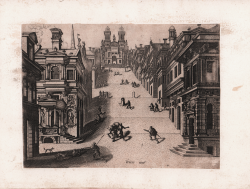 This plate belongs to a set of twenty eight plates showing small architectural perspective views engraved by J.van Doetecum after designs by Hans Vredeman de Vries, and the dedication plate to Atoine Perrenot, cardinal Granvelle. Drawing in reverse, signed and dated 1561, right half traced for transfer, in Berlin (KB, Hdz 1195).