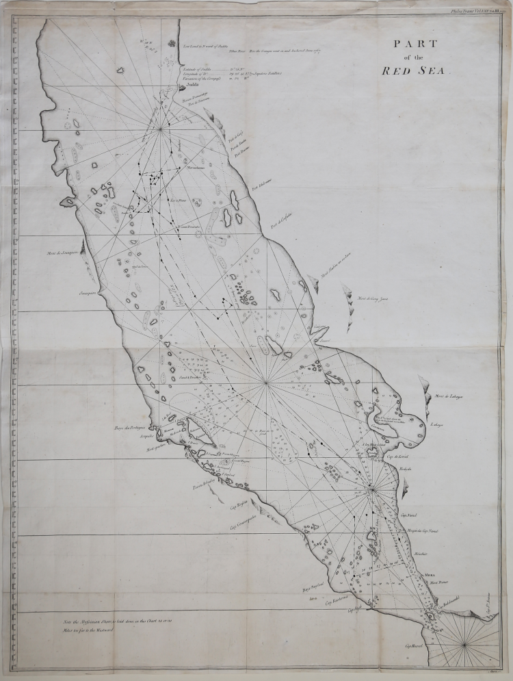 Finely executed map of the southern part of the Red Sea, which was published in A Letter to the Rev. Mr. Maskelyne, Astronomer Royal, F. R. S. Accompanying a New Chart of the Red Sea, with Two Draughts of the Roads of Mocha and Judda, and Several Observations Made during a Voyage on That Sea, by Capt. Charles Newland (January 1, 1772), published in the Philosophical Transactions of the Royal Geographical Society of London.