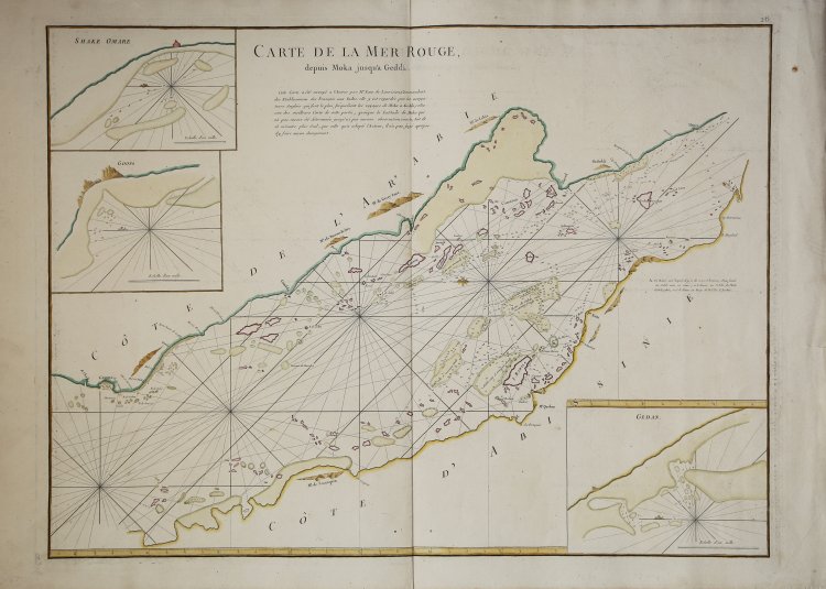 This map was sent to the author by Mr. Law de Laurison, Commandant of the French Establishments in India: it is looked upon there by the English navigators who most frequently travel from Mocha to Jeddah, as one of the best maps of this part; although the latitude of Mocha, which has not yet been determined by any exact observation, is 15 minutes more southerly than that adopted by the author, he has not judged it appropriate to make any change in it.