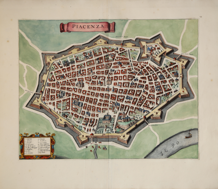Viene, dunque, pubblicata nella raccolta di Johannes Janssonius, Theatrum urbium Italiae aliarumque in insulis Maris Mediterraneae, Amsterdam s.d. (1657 circa), vol. V. Janssonius si propose di rinnovare il successo riscosso dalle Civitates orbis terrarum del Braun e riuscì ad acquistare in blocco la raccolta di rami dagli eredi dell'ultimo editore-incisore dell'opera di Colonia; eliminati quelli più deteriorati, ne aggiunse parecchi di nuovi, dando origine ad una splendida edizione ricca di tavole decorate da cartigli e cornici di gusto barocco, motivi cari all'autore che comprese le istanze del suo secolo e se ne fece portavoce. Alla fine del secolo Frederik de Wit, che già aveva al suo attivo edizioni di carte e di atlanti, venne in possesso dei rami pubblicati dallo Janssonius e preparò una nuova edizione intitolata Theatrum praecipuarum totius Europae urbium tam icono- graphice quam cospicue delineatarum, Amsterdam s.d. (1680 circa). La pianta non ha subito variazioni rispetto all'edizione di Janssonius, ma non reca il testo descrittivo al verso.